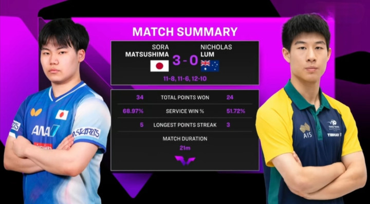 递补参赛的林文政,第一轮爆大冷淘汰了欧洲冠军达科,但是这一轮遇上日乒大胖小子松岛辉空,林文政的黑马运势,只能戛然而止!两个人都是左手,松岛辉空的反手杀伤力和摆速水准,都显著优于林文政。松岛辉空前两局光速取胜后,第三局开始习惯性摆了一阵子烂,随意随性的让林文政纠缠到了局末。最后松岛辉空险胜第三局,完成全场收割,3-0零封澳林,轻松晋级8强。