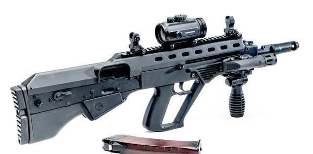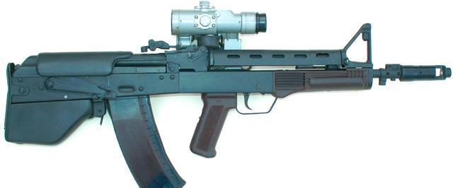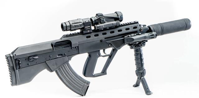 7.62×39毫米与5.45×39毫米口径的型号,显然使用了 新旧零件混合制造 。这一点从野外拍到的实枪照片可以得到印证。已知步枪使用了原AK的 枪管、前后机匣支座(trunnion)、枪机、机匣部分结构 。机匣被缩短,原有的准星与照门被移除,并在枪机框内安装了新的气活塞。 该枪具有 左右手通用操作件 。拉机柄在射击时不随枪机往复运动,可安装在任意一侧。机匣外壳带有一个大型 聚合物抛壳偏导板 ,可在左肩射击时保护射手面部。弹匣释放钮位于扳机后方。两种口径均使用标准AK弹匣。除扳机后方的弹匣释放钮外,在弹匣井内部后侧还有一个辅助释放杆。机匣结构设计为使弹匣在解锁后可在自重作用下自然落下。该枪还设有位于扳机上方的 按钮式保险 ,可用食指操作。
