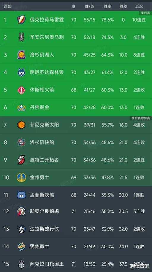 现在西部前六的球队基本确定,分别是雷霆、马刺、湖人、森林狼、火箭和掘金!雷霆已经拿到了55场胜利,领先了身后的马刺3个胜场,暂时不会有球队可以威胁他们的位置。马刺今天在主场凭借文班亚马的绝杀,以101-100险胜太阳,迎来一波4连胜,战绩刷新到52胜18负,成为雷霆之后又一支锁定季后赛席位的球队。他们领先了身后的对手至少7个胜场,可以说马刺和雷霆几乎确定了前二名的位置。